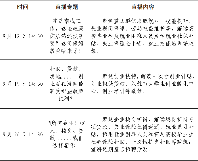 首场直播将于本周五(9月12日)下午14:30在“济南人社”微信视频号和齐鲁壹点新闻客户端同步开播。本场直播中,济南市人社部门为市民朋友们准备了一份“就业创业政策礼包”,聚焦重点群体求职就业、技能提升、失业期间保障、劳动权益维护等问题,解读高校毕业生及就业困难人员灵活就业社保补贴、失业保险金申领、就业技能培训等政策。届时,广大市民朋友可在“济南人社”官方视频号、齐鲁壹点直播页面互动提问,直播嘉宾将为大家实时互动解答。